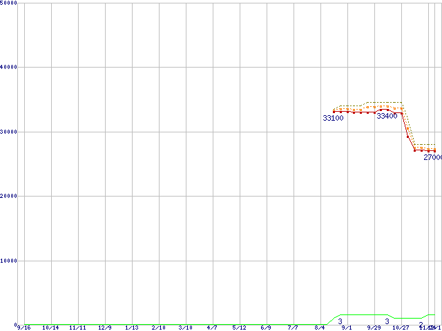 ※このグラフは過去のデータも税率5%相当に調整した税込み相当額のグラフです。 税率変更や、総額表示方式導入(2004年4月)の影響は除いています。 | | | ●凡例 | 最安値 (点線部は販売店未確認 または未調査) | 平均値 | 最高値 | ショップ数 |