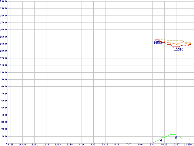 ※このグラフは過去のデータも税率5%相当に調整した税込み相当額のグラフです。 税率変更や、総額表示方式導入(2004年4月)の影響は除いています。 | | | ●凡例 | 最安値 (点線部は販売店未確認 または未調査) | 平均値 | 最高値 | ショップ数 |