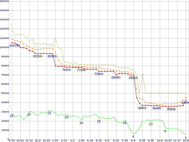 ※このグラフは過去のデータも税率5%相当に調整した税込み相当額のグラフです。 税率変更や、総額表示方式導入(2004年4月)の影響は除いています。 | | | ●凡例 | 最安値 (点線部は販売店未確認 または未調査) | 平均値 | 最高値 | ショップ数 |