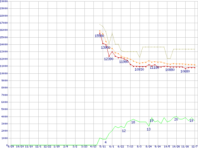 ※このグラフは過去のデータも税率5%相当に調整した税込み相当額のグラフです。 税率変更や、総額表示方式導入(2004年4月)の影響は除いています。 | | | ●凡例 | 最安値 (点線部は販売店未確認 または未調査) | 平均値 | 最高値 | ショップ数 |