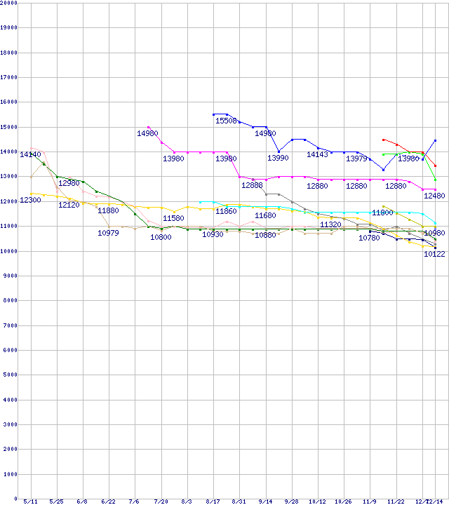 | HDD主要製品(最安値1万円~1万5千円未満)の最安値推移 | | | (2006年5月11日~2006年12月14日) |
