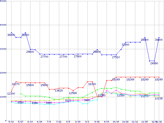 メモリ主要製品(最安値1万円以上)の最安値推移