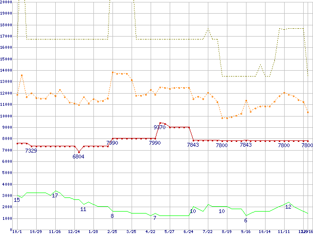 ※このグラフは過去のデータも税率5%相当に調整した税込み相当額のグラフです。 税率変更や、総額表示方式導入(2004年4月)の影響は除いています。 | | | ●凡例 | 最安値 (点線部は販売店未確認 または未調査) | 平均値 | 最高値 | ショップ数 |