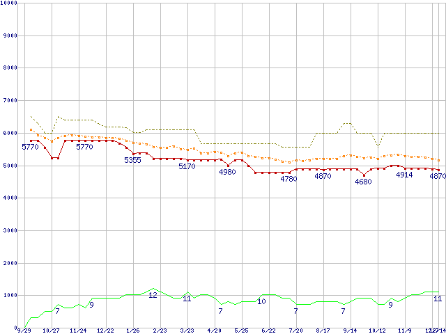 ※このグラフは過去のデータも税率5%相当に調整した税込み相当額のグラフです。 税率変更や、総額表示方式導入(2004年4月)の影響は除いています。 | | | ●凡例 | 最安値 (点線部は販売店未確認 または未調査) | 平均値 | 最高値 | ショップ数 |