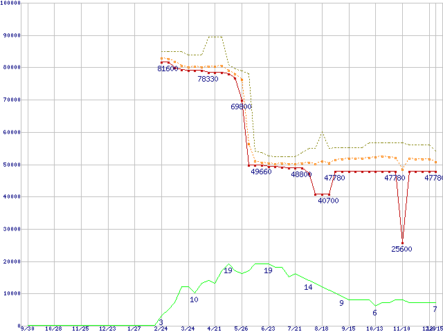 ※このグラフは過去のデータも税率5%相当に調整した税込み相当額のグラフです。 税率変更や、総額表示方式導入(2004年4月)の影響は除いています。 | | | ●凡例 | 最安値 (点線部は販売店未確認 または未調査) | 平均値 | 最高値 | ショップ数 |