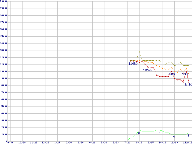 ※このグラフは過去のデータも税率5%相当に調整した税込み相当額のグラフです。 税率変更や、総額表示方式導入(2004年4月)の影響は除いています。 | | | ●凡例 | 最安値 (点線部は販売店未確認 または未調査) | 平均値 | 最高値 | ショップ数 |