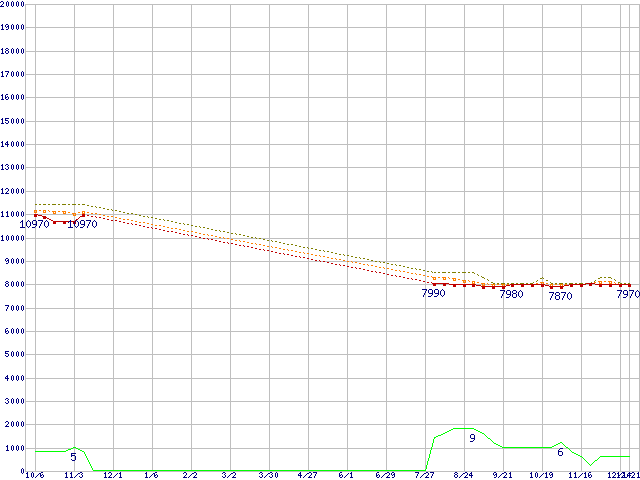 ※このグラフは過去のデータも税率5%相当に調整した税込み相当額のグラフです。 税率変更や、総額表示方式導入(2004年4月)の影響は除いています。 | | | ●凡例 | 最安値 (点線部は販売店未確認 または未調査) | 平均値 | 最高値 | ショップ数 |