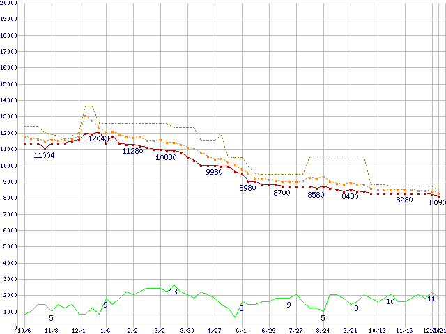 ※このグラフは過去のデータも税率5%相当に調整した税込み相当額のグラフです。 税率変更や、総額表示方式導入(2004年4月)の影響は除いています。 | | | ●凡例 | 最安値 (点線部は販売店未確認 または未調査) | 平均値 | 最高値 | ショップ数 |