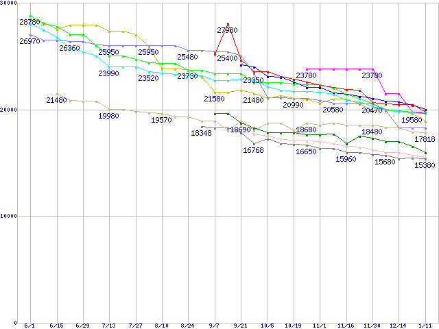 HDD主要製品(最安値1万5千円~2万円未満)の最安値推移