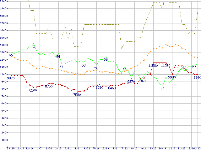 ※このグラフは過去のデータも税率5%相当に調整した税込み相当額のグラフです。 税率変更や、総額表示方式導入(2004年4月)の影響は除いています。 | | | ●凡例 | 最安値 (点線部は販売店未確認 または未調査) | 平均値 | 最高値 | ショップ数 |