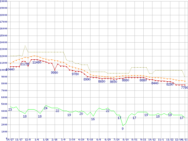 ※このグラフは過去のデータも税率5%相当に調整した税込み相当額のグラフです。 税率変更や、総額表示方式導入(2004年4月)の影響は除いています。 | | | ●凡例 | 最安値 (点線部は販売店未確認 または未調査) | 平均値 | 最高値 | ショップ数 |