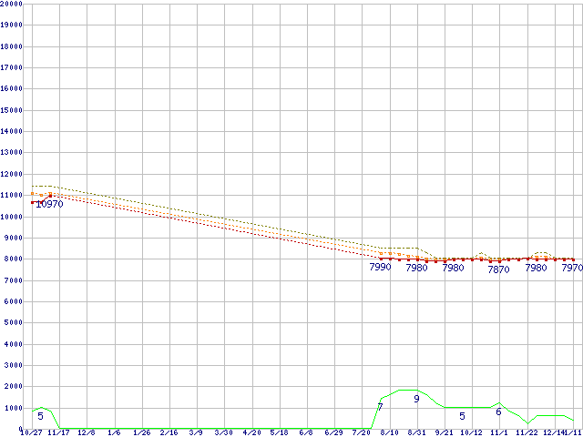 ※このグラフは過去のデータも税率5%相当に調整した税込み相当額のグラフです。 税率変更や、総額表示方式導入(2004年4月)の影響は除いています。 | | | ●凡例 | 最安値 (点線部は販売店未確認 または未調査) | 平均値 | 最高値 | ショップ数 |