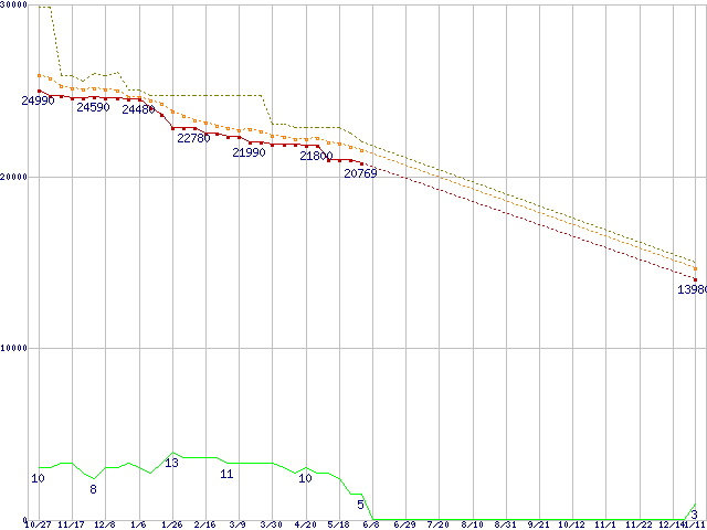 ※このグラフは過去のデータも税率5%相当に調整した税込み相当額のグラフです。 税率変更や、総額表示方式導入(2004年4月)の影響は除いています。 | | | ●凡例 | 最安値 (点線部は販売店未確認 または未調査) | 平均値 | 最高値 | ショップ数 |