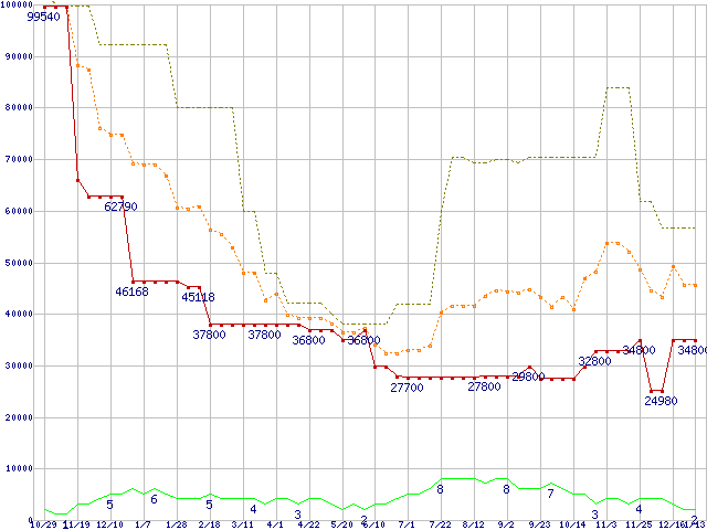 ※このグラフは過去のデータも税率5%相当に調整した税込み相当額のグラフです。 税率変更や、総額表示方式導入(2004年4月)の影響は除いています。 | | | ●凡例 | 最安値 (点線部は販売店未確認 または未調査) | 平均値 | 最高値 | ショップ数 |