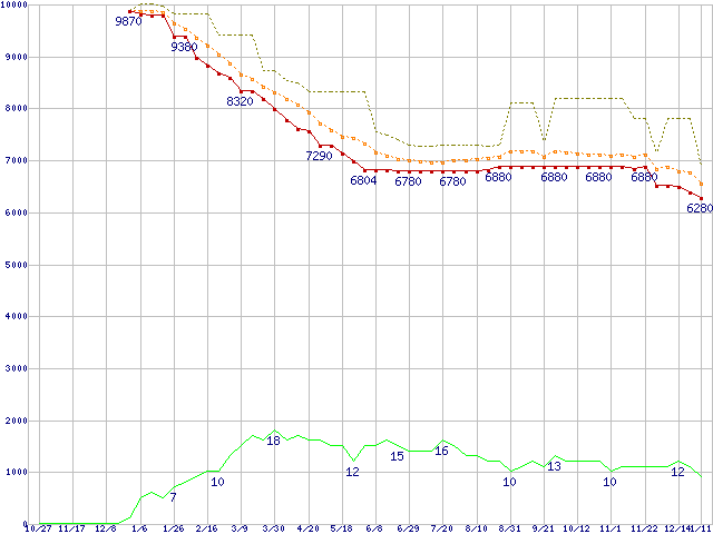 ※このグラフは過去のデータも税率5%相当に調整した税込み相当額のグラフです。 税率変更や、総額表示方式導入(2004年4月)の影響は除いています。 | | | ●凡例 | 最安値 (点線部は販売店未確認 または未調査) | 平均値 | 最高値 | ショップ数 |