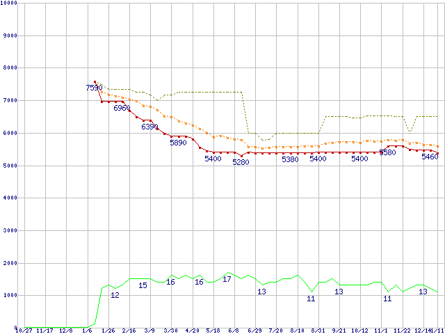 ※このグラフは過去のデータも税率5%相当に調整した税込み相当額のグラフです。 税率変更や、総額表示方式導入(2004年4月)の影響は除いています。 | | | ●凡例 | 最安値 (点線部は販売店未確認 または未調査) | 平均値 | 最高値 | ショップ数 |