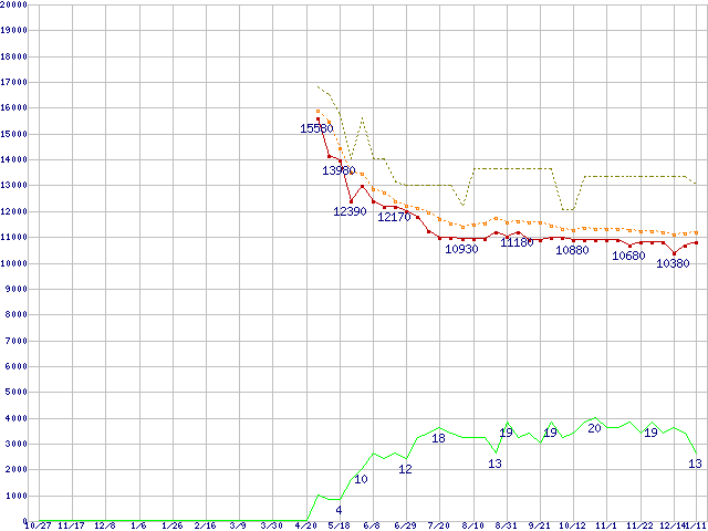 ※このグラフは過去のデータも税率5%相当に調整した税込み相当額のグラフです。 税率変更や、総額表示方式導入(2004年4月)の影響は除いています。 | | | ●凡例 | 最安値 (点線部は販売店未確認 または未調査) | 平均値 | 最高値 | ショップ数 |