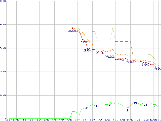 ※このグラフは過去のデータも税率5%相当に調整した税込み相当額のグラフです。 税率変更や、総額表示方式導入(2004年4月)の影響は除いています。 | | | ●凡例 | 最安値 (点線部は販売店未確認 または未調査) | 平均値 | 最高値 | ショップ数 |