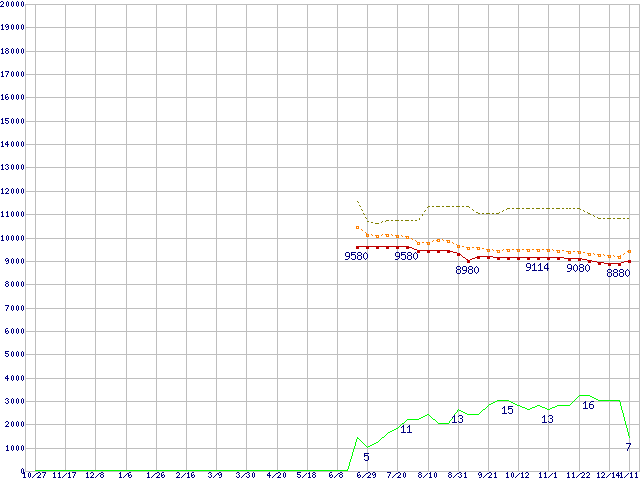 ※このグラフは過去のデータも税率5%相当に調整した税込み相当額のグラフです。 税率変更や、総額表示方式導入(2004年4月)の影響は除いています。 | | | ●凡例 | 最安値 (点線部は販売店未確認 または未調査) | 平均値 | 最高値 | ショップ数 |