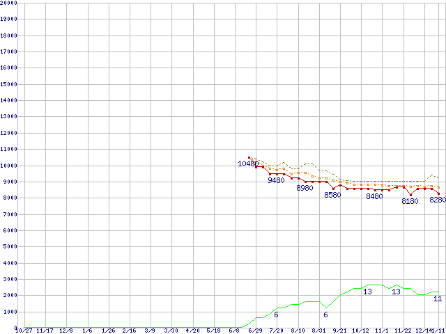 ※このグラフは過去のデータも税率5%相当に調整した税込み相当額のグラフです。 税率変更や、総額表示方式導入(2004年4月)の影響は除いています。 | | | ●凡例 | 最安値 (点線部は販売店未確認 または未調査) | 平均値 | 最高値 | ショップ数 |