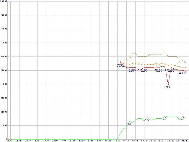※このグラフは過去のデータも税率5%相当に調整した税込み相当額のグラフです。 税率変更や、総額表示方式導入(2004年4月)の影響は除いています。 | | | ●凡例 | 最安値 (点線部は販売店未確認 または未調査) | 平均値 | 最高値 | ショップ数 |