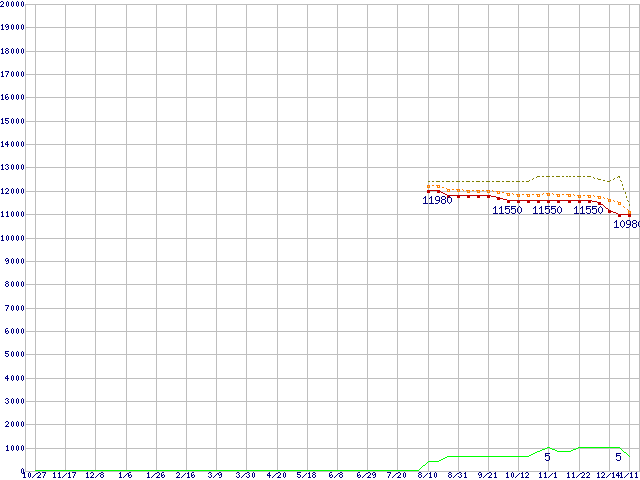 ※このグラフは過去のデータも税率5%相当に調整した税込み相当額のグラフです。 税率変更や、総額表示方式導入(2004年4月)の影響は除いています。 | | | ●凡例 | 最安値 (点線部は販売店未確認 または未調査) | 平均値 | 最高値 | ショップ数 |