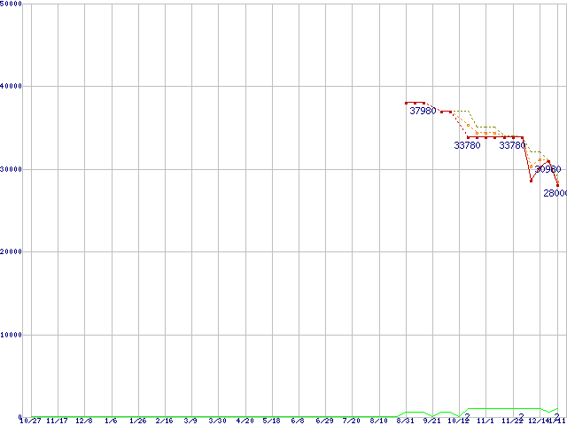 ※このグラフは過去のデータも税率5%相当に調整した税込み相当額のグラフです。 税率変更や、総額表示方式導入(2004年4月)の影響は除いています。 | | | ●凡例 | 最安値 (点線部は販売店未確認 または未調査) | 平均値 | 最高値 | ショップ数 |