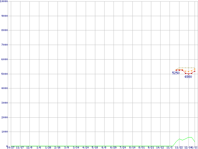※このグラフは過去のデータも税率5%相当に調整した税込み相当額のグラフです。 税率変更や、総額表示方式導入(2004年4月)の影響は除いています。 | | | ●凡例 | 最安値 (点線部は販売店未確認 または未調査) | 平均値 | 最高値 | ショップ数 |