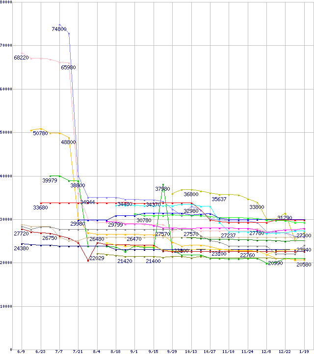 | CPU主要製品(最安値2万円~3万円未満)の最安値推移 | | | (2006年6月9日~2007年1月19日) |