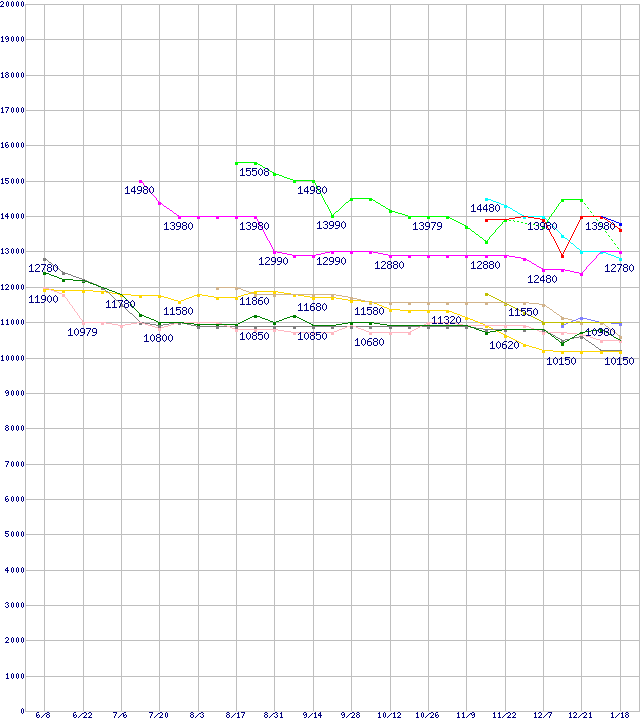 HDD主要製品(最安値1万円~1万5千円未満)の最安値推移