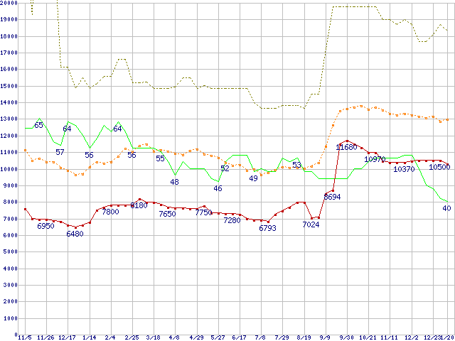 ※このグラフは過去のデータも税率5%相当に調整した税込み相当額のグラフです。 税率変更や、総額表示方式導入(2004年4月)の影響は除いています。 | | | ●凡例 | 最安値 (点線部は販売店未確認 または未調査) | 平均値 | 最高値 | ショップ数 |