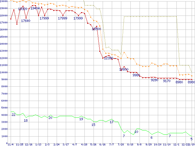 ※このグラフは過去のデータも税率5%相当に調整した税込み相当額のグラフです。 税率変更や、総額表示方式導入(2004年4月)の影響は除いています。 | | | ●凡例 | 最安値 (点線部は販売店未確認 または未調査) | 平均値 | 最高値 | ショップ数 |