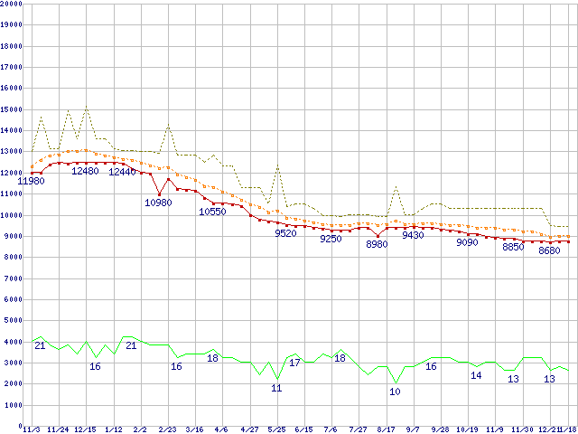 ※このグラフは過去のデータも税率5%相当に調整した税込み相当額のグラフです。 税率変更や、総額表示方式導入(2004年4月)の影響は除いています。 | | | ●凡例 | 最安値 (点線部は販売店未確認 または未調査) | 平均値 | 最高値 | ショップ数 |