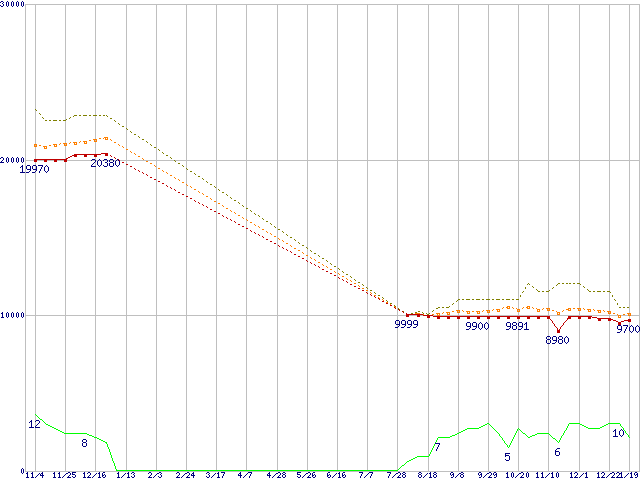 ※このグラフは過去のデータも税率5%相当に調整した税込み相当額のグラフです。 税率変更や、総額表示方式導入(2004年4月)の影響は除いています。 | | | ●凡例 | 最安値 (点線部は販売店未確認 または未調査) | 平均値 | 最高値 | ショップ数 |
