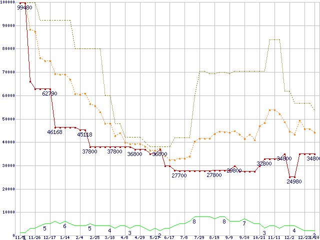 ※このグラフは過去のデータも税率5%相当に調整した税込み相当額のグラフです。 税率変更や、総額表示方式導入(2004年4月)の影響は除いています。 | | | ●凡例 | 最安値 (点線部は販売店未確認 または未調査) | 平均値 | 最高値 | ショップ数 |