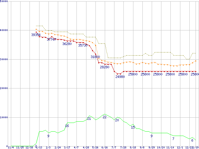 ※このグラフは過去のデータも税率5%相当に調整した税込み相当額のグラフです。 税率変更や、総額表示方式導入(2004年4月)の影響は除いています。 | | | ●凡例 | 最安値 (点線部は販売店未確認 または未調査) | 平均値 | 最高値 | ショップ数 |