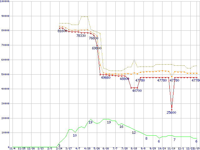 ※このグラフは過去のデータも税率5%相当に調整した税込み相当額のグラフです。 税率変更や、総額表示方式導入(2004年4月)の影響は除いています。 | | | ●凡例 | 最安値 (点線部は販売店未確認 または未調査) | 平均値 | 最高値 | ショップ数 |