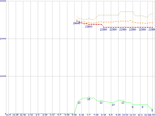 ※このグラフは過去のデータも税率5%相当に調整した税込み相当額のグラフです。 税率変更や、総額表示方式導入(2004年4月)の影響は除いています。 | | | ●凡例 | 最安値 (点線部は販売店未確認 または未調査) | 平均値 | 最高値 | ショップ数 |