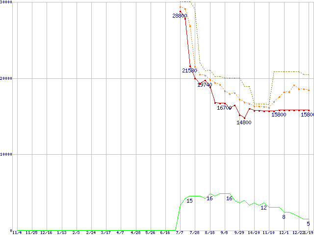 ※このグラフは過去のデータも税率5%相当に調整した税込み相当額のグラフです。 税率変更や、総額表示方式導入(2004年4月)の影響は除いています。 | | | ●凡例 | 最安値 (点線部は販売店未確認 または未調査) | 平均値 | 最高値 | ショップ数 |