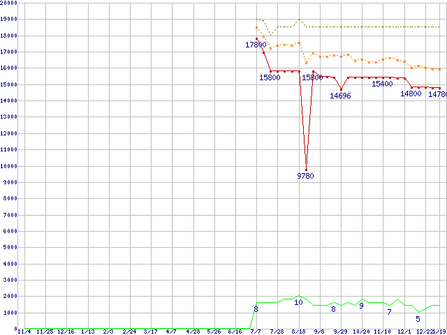 ※このグラフは過去のデータも税率5%相当に調整した税込み相当額のグラフです。 税率変更や、総額表示方式導入(2004年4月)の影響は除いています。 | | | ●凡例 | 最安値 (点線部は販売店未確認 または未調査) | 平均値 | 最高値 | ショップ数 |