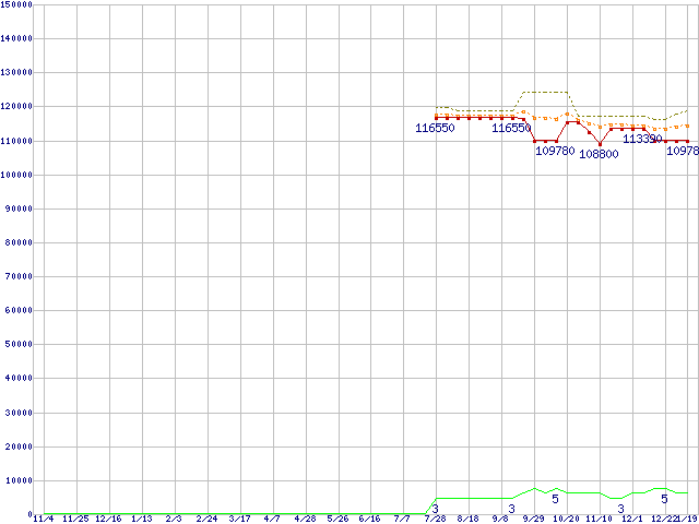 ※このグラフは過去のデータも税率5%相当に調整した税込み相当額のグラフです。 税率変更や、総額表示方式導入(2004年4月)の影響は除いています。 | | | ●凡例 | 最安値 (点線部は販売店未確認 または未調査) | 平均値 | 最高値 | ショップ数 |