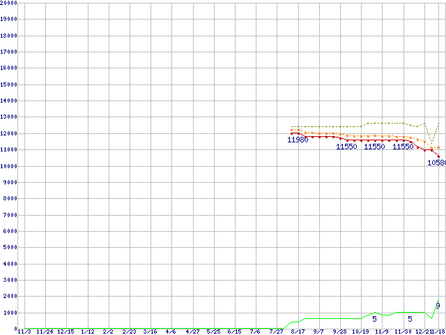 ※このグラフは過去のデータも税率5%相当に調整した税込み相当額のグラフです。 税率変更や、総額表示方式導入(2004年4月)の影響は除いています。 | | | ●凡例 | 最安値 (点線部は販売店未確認 または未調査) | 平均値 | 最高値 | ショップ数 |