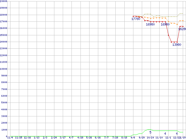 ※このグラフは過去のデータも税率5%相当に調整した税込み相当額のグラフです。 税率変更や、総額表示方式導入(2004年4月)の影響は除いています。 | | | ●凡例 | 最安値 (点線部は販売店未確認 または未調査) | 平均値 | 最高値 | ショップ数 |