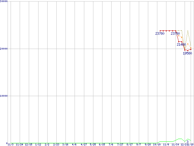 ※このグラフは過去のデータも税率5%相当に調整した税込み相当額のグラフです。 税率変更や、総額表示方式導入(2004年4月)の影響は除いています。 | | | ●凡例 | 最安値 (点線部は販売店未確認 または未調査) | 平均値 | 最高値 | ショップ数 |