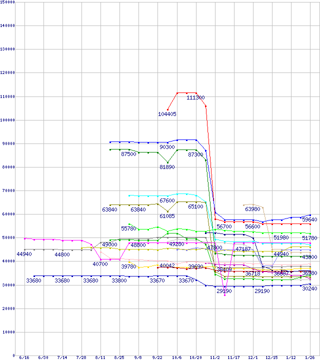 CPU主要製品(最安値3万円~6万円未満)の最安値推移 | | (2006年6月16日~2007年1月26日) |