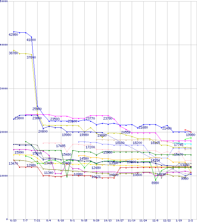 | CPU主要製品(最安値1万円~2万円未満)の最安値推移 | | | (2006年6月23日~2007年2月2日) |