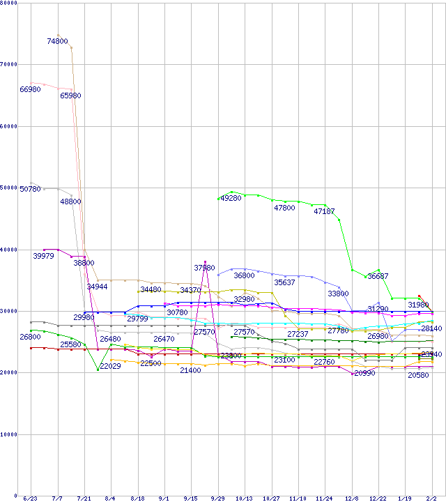 | CPU主要製品(最安値2万円~3万円未満)の最安値推移 | | | (2006年6月23日~2007年2月2日) |