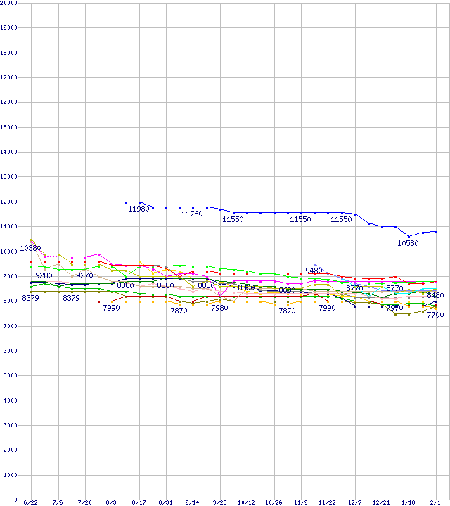 | HDD 250~300GB未満の最安値推移 | | | (2006年6月22日~2007年2月1日) |