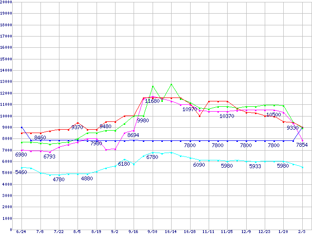 メモリ主要製品(最安値5千円~1万円未満)の最安値推移
