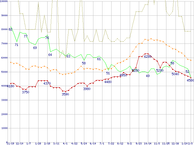 ※このグラフは過去のデータも税率5%相当に調整した税込み相当額のグラフです。 税率変更や、総額表示方式導入(2004年4月)の影響は除いています。 | | | ●凡例 | 最安値 (点線部は販売店未確認 または未調査) | 平均値 | 最高値 | ショップ数 |